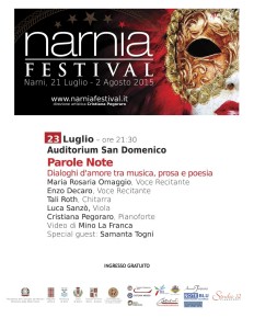 Narnia Festival 2015 “Cristiana & Friends” con la partecipazione di musicisti dell’Accademia Nazionale di Santa Cecilia Cristiana Pegoraro, Pianoforte Carlo Maria Parazzoli, Violino Paolo Piomboni, Violino Luca Sanzò, Viola Ilona Balint, Viola Diego Romano, Violoncello Antonio Sciancalepore, Contrabbasso Special guests: Samantha Di Paolo e Daniel Montaño, ballerini di tango argentino Narni, Teatro Comunale 29 Luglio… Leggi tutto »